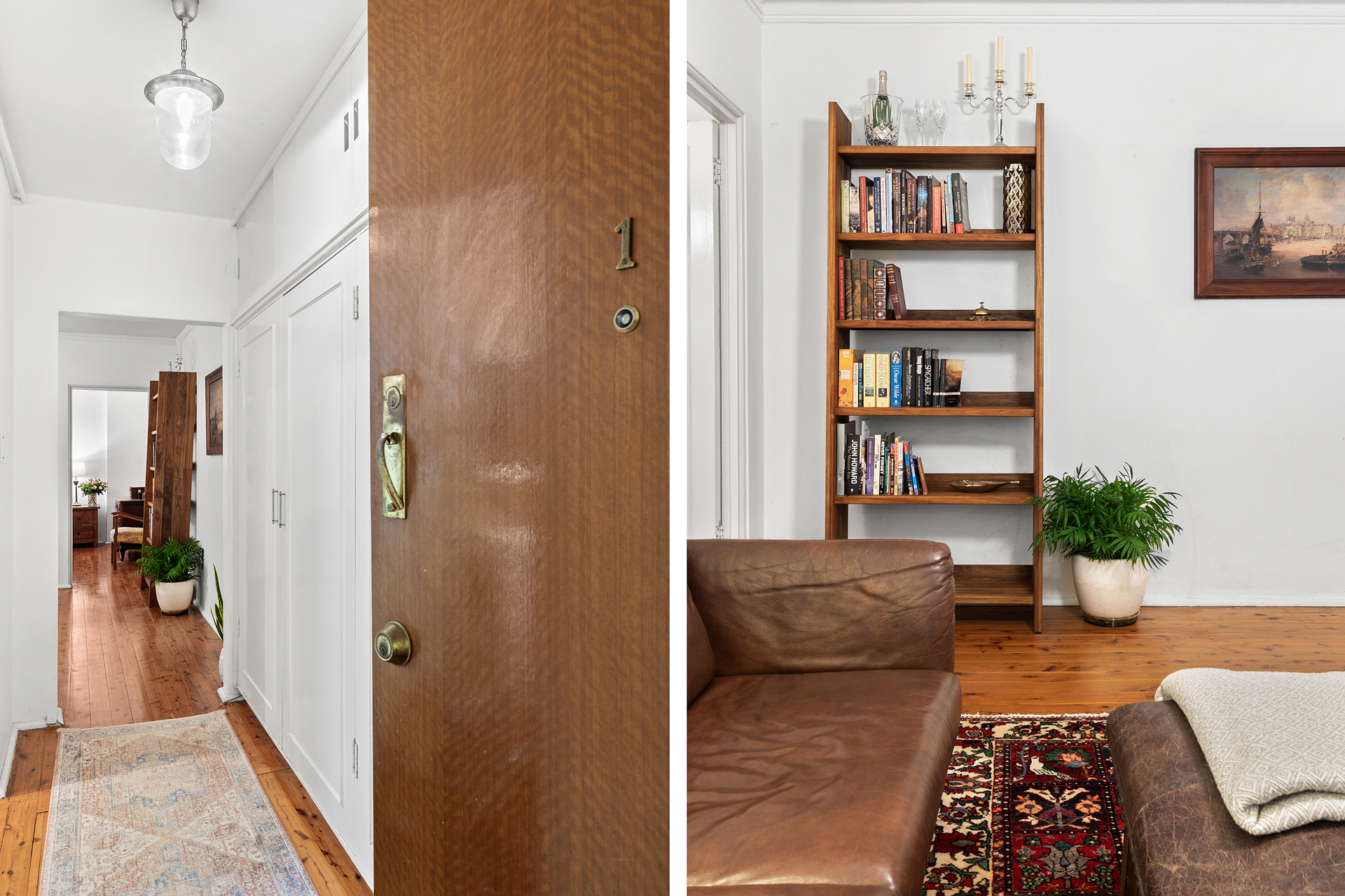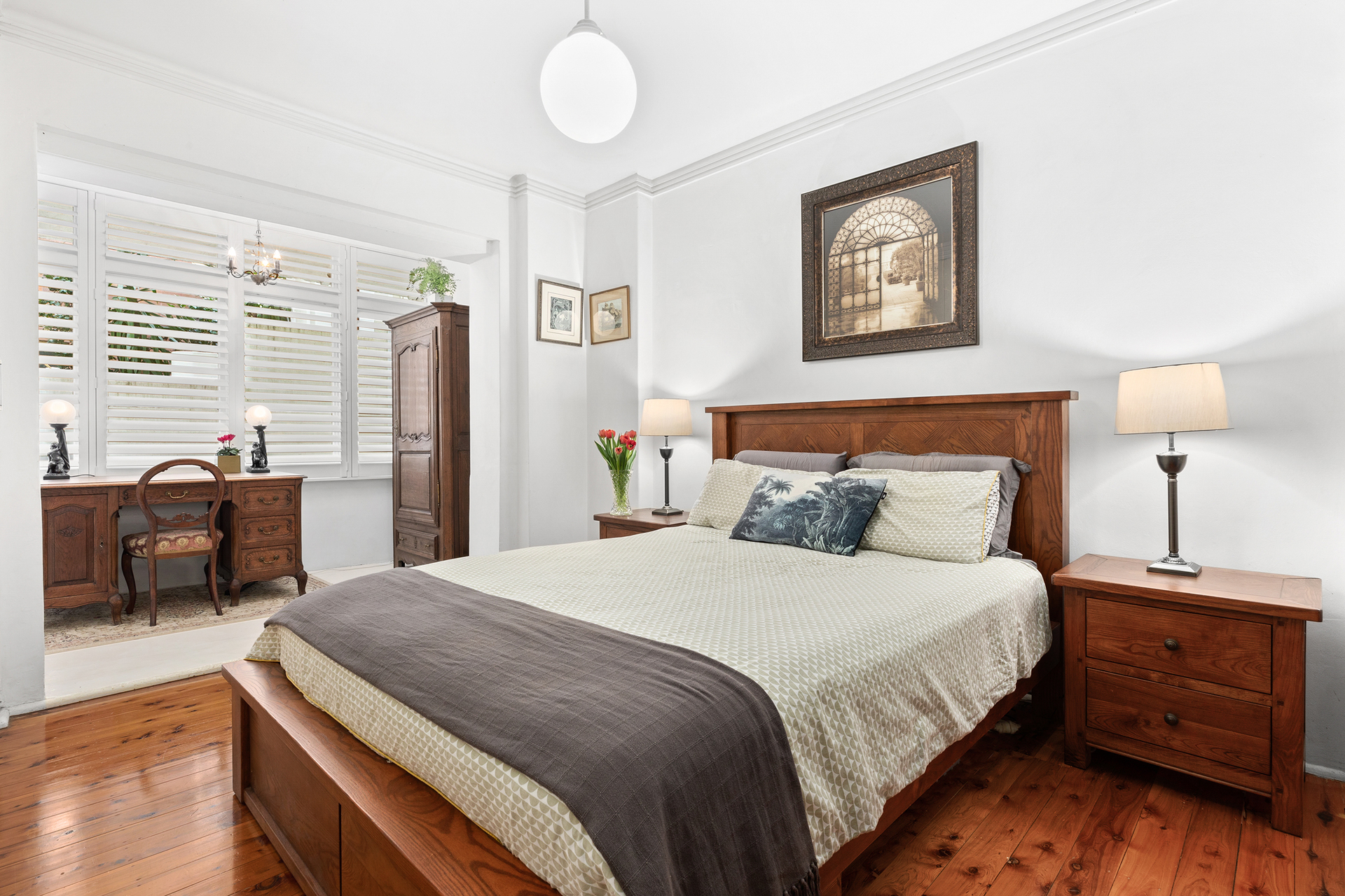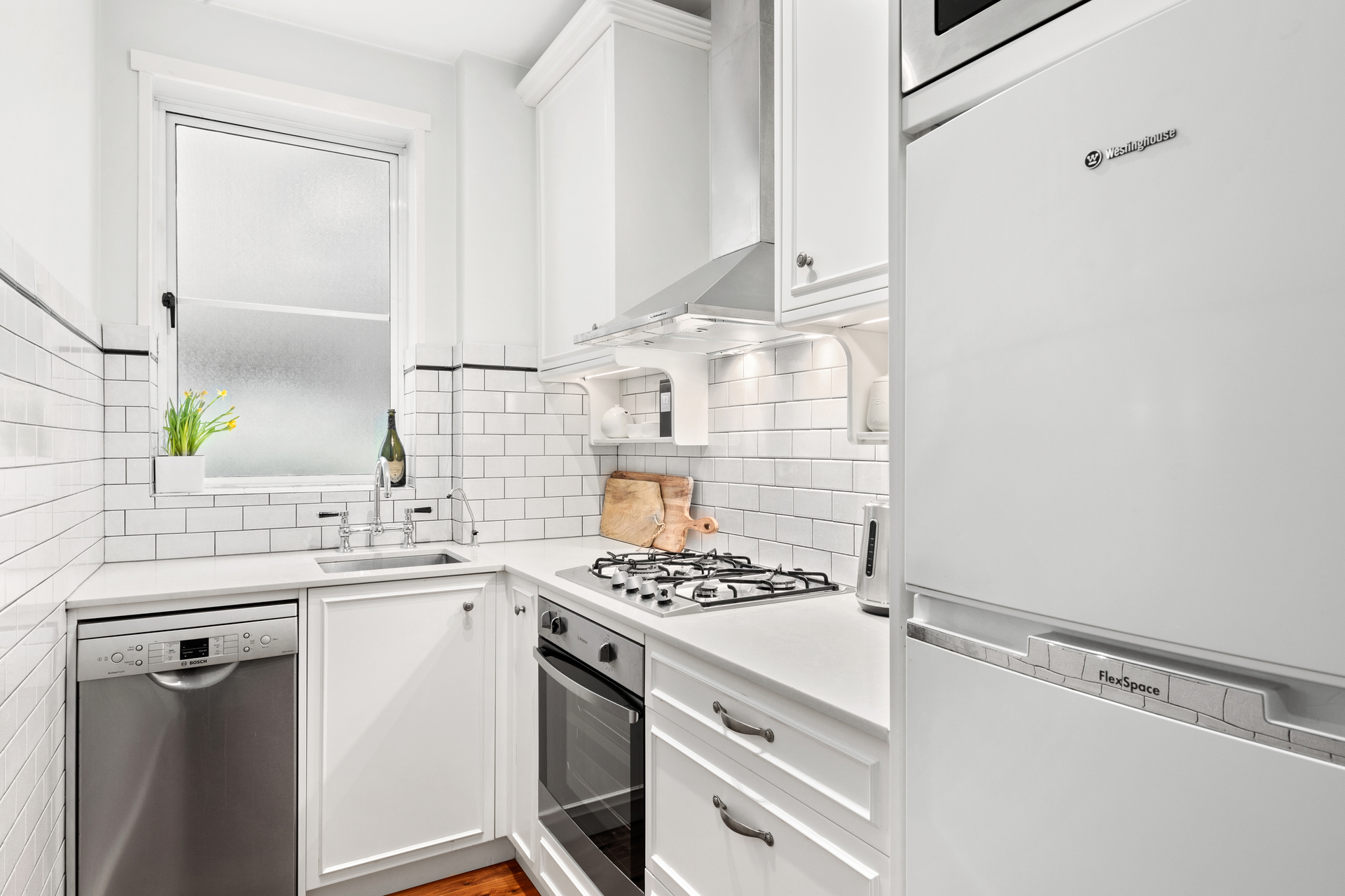 . Original fireplace and cocktail cabinet . Modern gas kitchen, European appliances, dishwasher, and full-size refrigerator included . Gas bayonet heating point in living room . Chic Art Deco bathroom with bath and new vanity . King-size bedroom with generous built-in wardrobe . Study (adjacent to the bedroom) overlooking leafy planter boxes . High ceilings . Plantation shutters . Polished original timber floorboards . Residents' garden and laundry . Residents' bicycle storage . Quiet & convenient location close to the harbour foreshore . Pet-friendly building (subject to approval)