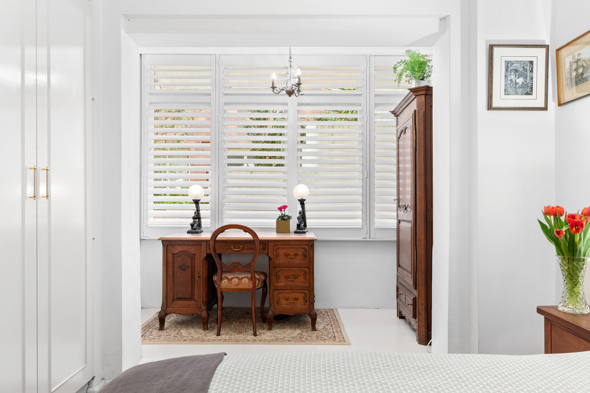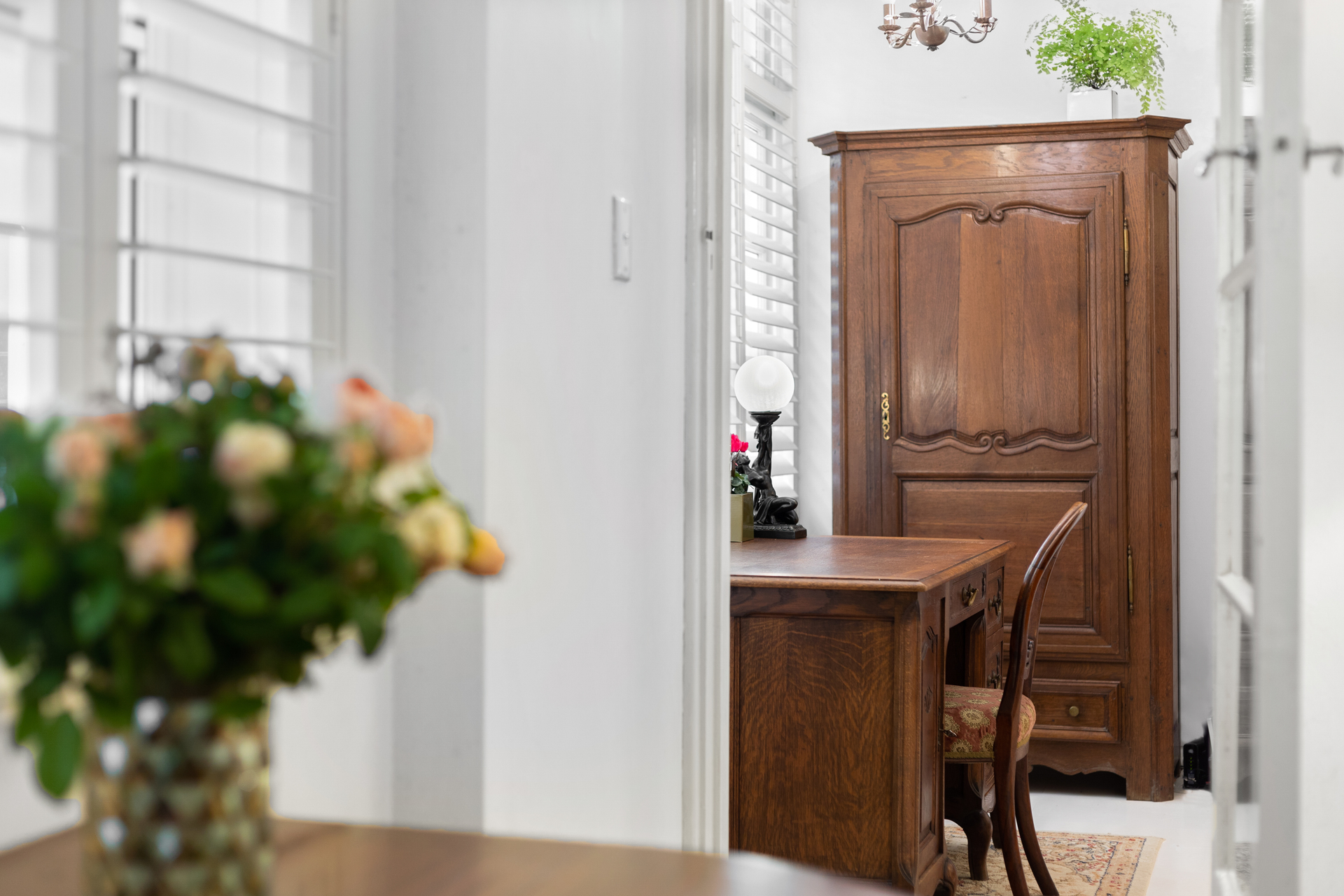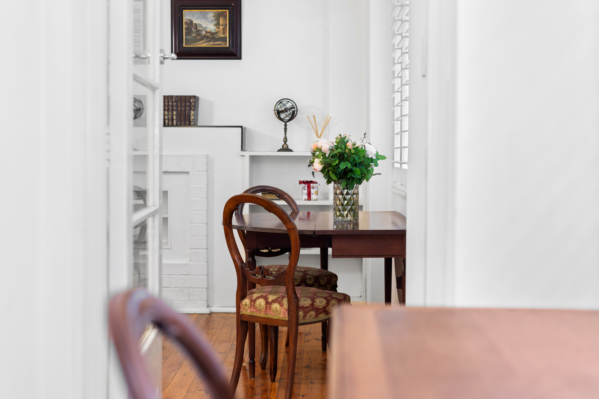 . Original fireplace and cocktail cabinet . Modern gas kitchen, European appliances, dishwasher, and full-size refrigerator included . Gas bayonet heating point in living room . Chic Art Deco bathroom with bath and new vanity . King-size bedroom with generous built-in wardrobe . Study (adjacent to the bedroom) overlooking leafy planter boxes . High ceilings . Plantation shutters . Polished original timber floorboards . Residents' garden and laundry . Residents' bicycle storage . Quiet & convenient location close to the harbour foreshore . Pet-friendly building (subject to approval)